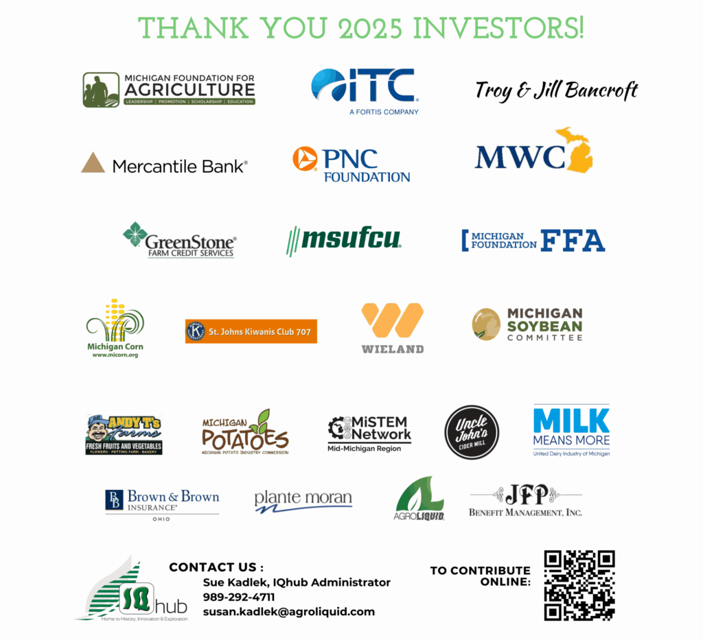 With nearly 20,000 people through our museum annually, we hope you will find the business sponsorship investment a rewarding marketing activity. Sponsors are promoted a number of ways on museum signage, quarterly e-newsletters, IQhub website, etc. Your investment assures that the IQhub will continue its work in agricultural education. Please call us at 989-292-4711 or email: susan.kadlek@agroliquid.com to become an IQhub supporter & partner!